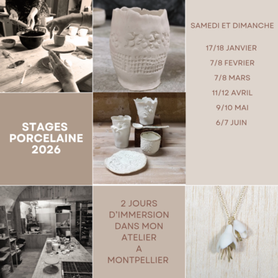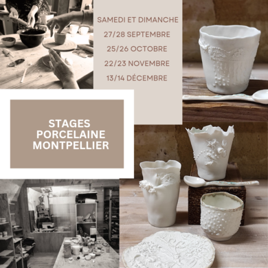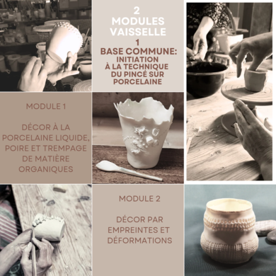 Vous apprendrez à jouer avec la matière pour l'amener à plus de finesse et de transparence, à créer des décors à partir de porcelaine liquide, à la poire ou par trempage de matières organique.